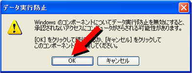 ※ハードウェアによるDEPをサポートしたPCでは、下のダイアログが表示されます。一度、インストールを中止して下記の手順でインストールを行ってください。